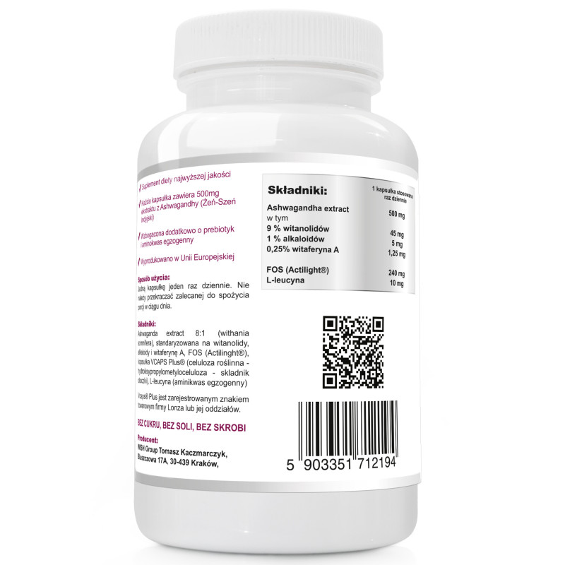 Ashwaganda extract 8:1 (withania somnifera), standaryzowana na witanolidy, alkaloidy i witaferynę A, FOS (Actilinght®), kapsułka VCAPS Plus® (celuloza roślinna - hydroksypropylome - tyloceluloza - skladnik otoczki), L-leucyna (aminikwas egzogenny).