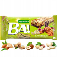 Baton zbożowy BA! to kompozycja zbóż wzbogacona najwyższej jakości orzechami: orzechami laskowymi, orzechami włoskimi, chrupiącymi nerkowcami, migdałami i smacznymi orzeszkami arachidowymi