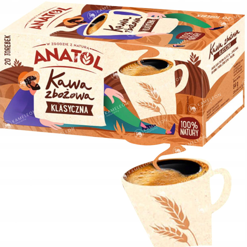 KAWA ZBOŻOWA ANATOL klasyczna to kawa o wyjątkowo bogatym, pełnym smaku i niesłychanym aromacie, który zawdzięcza w 100% naturalnym składnikom.
