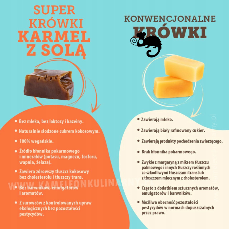 Wyjątkowe wegańskie krówki bezmleczne karmel z solą (150 g) zaskoczą Cię nietuzinkowym smakiem i czystym składem. Niepowtarzalna receptura bazuje na proszku i cukrze kokosowym, dzięki czemu nasze ekologiczne krówki nie zawierają laktozy, nabiału i białego cukru. Są także wolne od glutenu, oleju palmowego, sztucznych dodatków i GMO.
