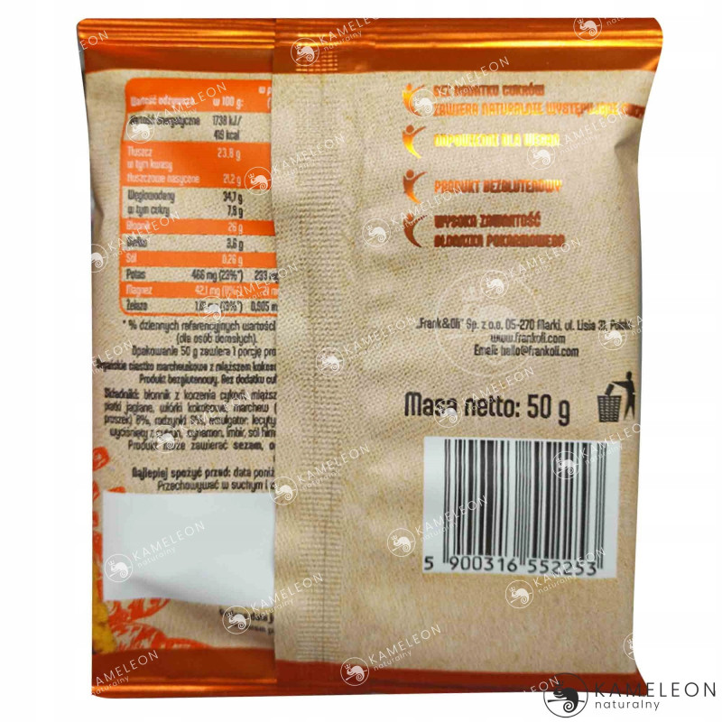 Błonnik z korzenia cykorii, miąższ kokosowy 22%, płatki jaglane, wiórki kokosowe, marchew (zagęszczony sok proszek) 8%, rodzynki 6%, emulgator: lecytyny z rzepaku, sok wyciśnięty z cytryn, cynamon, imbir, sól himalajska, kardamon.