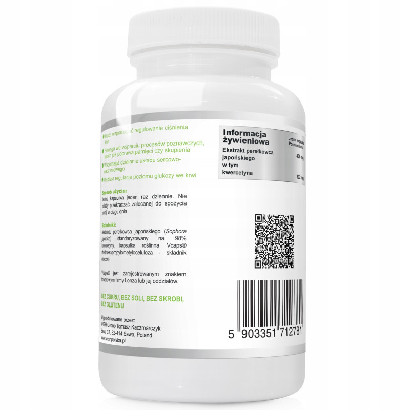 SKŁADNIKI: Ekstraktu perełkowca japońskiego (Sophora japonica) standaryzowany na 98% kwercetyny, kapsułka roślinna Vcaps® (hydroksypropylometyloceluloza - składnik otoczki)