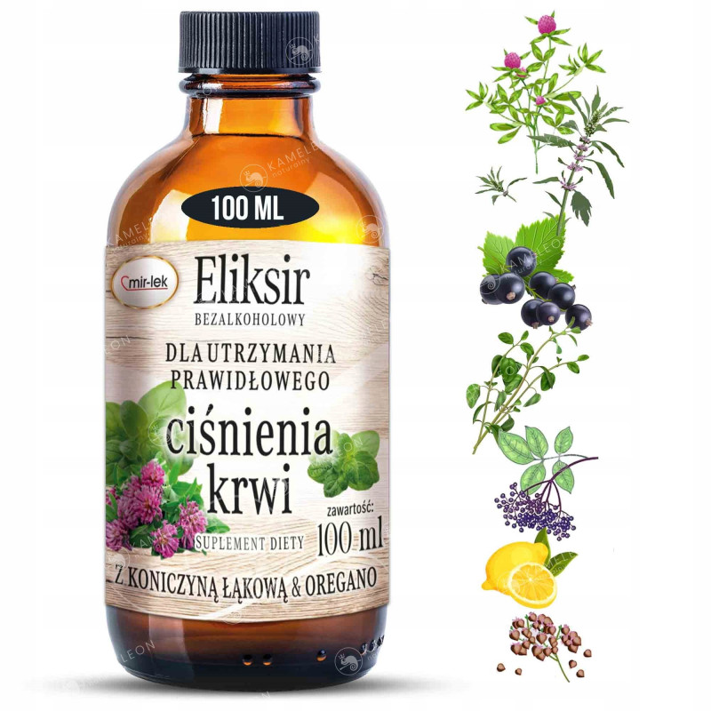 ELIKSIR dla prawidłowego ciśnienia krwi powstał z wyciągów z roślin takich jak: koniczyna łąkowa, serdecznik, czarna porzeczka, czarny bez, oregano, gryka.