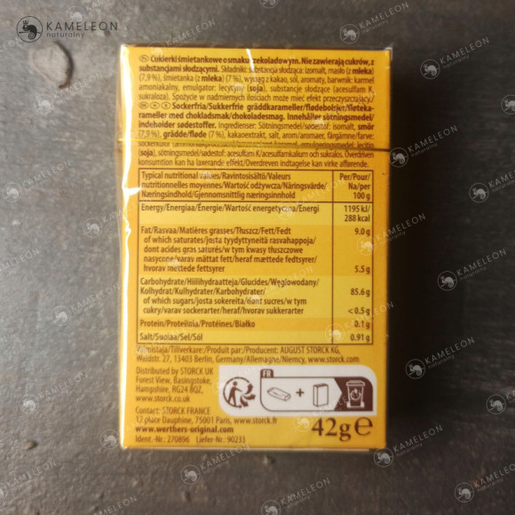 Wyjątkowe karmelki o smaku czekoladowym Werther’s Original austriackiej firmy Storck to produkt bez cukru, stworzony na podstawie tradycyjnej receptury, jednak o niższej niż w przypadku znanego na całym świecie pierwowzoru tych słodyczy wartości kalorycznej. Substancją słodzącą jest tutaj izomalt. W składzie znalazły się też m.in. śmietanka z mleka (7%), masło z mleka (7,9%) oraz wyciąg z kakao.