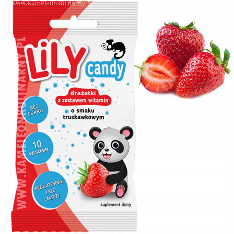 Drażetki LiLY Candy z zestawem 10 witamin o smaku truskawkowym, to bezcukrowy, bezlaktozowy i bezglutenowy suplement diety. Drażetki przeznaczone dla dzieci powyżej 3 roku życia i osób dorosłych. Witamina C wspomaga prawidłowe funkcjonowanie układu odpornościowego. Witamina E chroni komórki przed stresem oksydacyjnym, a witamina B12 wspomaga pracę układu nerwowego oraz systemu odpornościowego.