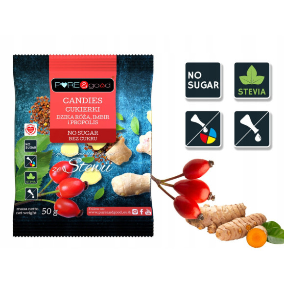 Cukierki dzika róża / imbir / propolis bez dodatku cukru z glikozydami stewiolowymi i izomaltem. Landrynki ziołowo-owocowe słodzone stewią odpowiednie dla diabetyków.