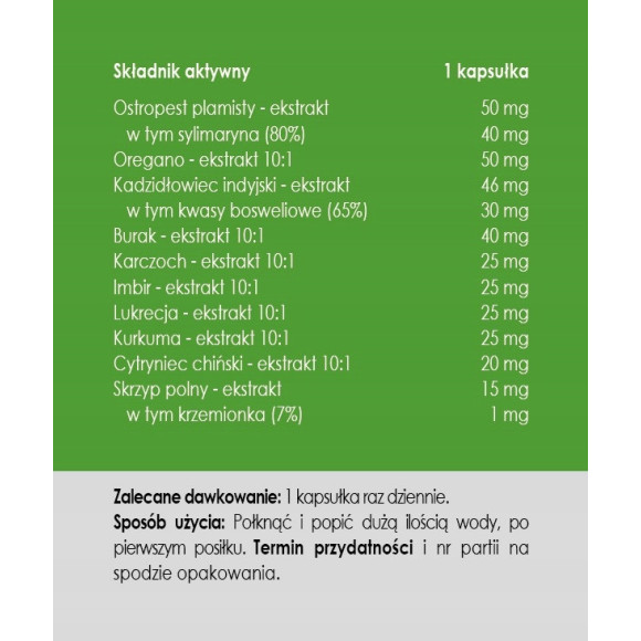Składniki: ekstrakt z owoców ostropestu plamistego (Silybum marianum) standaryzowany na zawartość min. 80% sylimaryny, ekstrakt z oregano (Origanum vulgare) 10:1, ekstrakt z żywicy kory kadzidłowca indyjskiego (Boswellia serrata) standaryzowany na zawartość min. 65% kwasów bosweliowych, ekstrakt z korzenia buraka (Beta vulgaris) 10:1, inulina; ekstrakt z liści karczocha (Cynara scolymus) 10:1, ekstrakt z kłącza imbiru lekarskiego (Zingiber officinale) 10:1, ekstrakt z korzenia lukrecji gładkiej (Glycyrrhiza glabra) 10:1, ekstrakt z kłącza kurkumy (Curcuma longa) 10:1, ekstrakt z cytryńca chińskiego(Schisandra Chinensis) 10:1, ekstrakt z ziela skrzypu polnego (Equisetum arvense) standaryzowany na zawartość min. 7% krzemionki. Skład kapsułki: celuloza roślinna