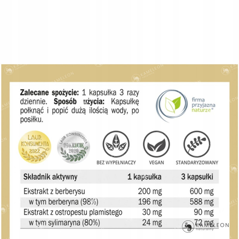 Ekstrakt z korzenia berberysu (Berberis aristata) standaryzowany na zawartość 98% berberyny, ekstrakt z ostropestu plamistego (Silybum marianum) standaryzowany na zawartość min. 80% sylimaryny.