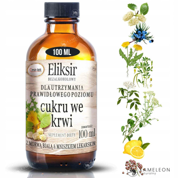 ELIKSIR dla utrzymania właściwego poziomu cukru we krwi powstał z wyciągów z roślin takich jak:: jałowiec, morwa , mniszek lekarski, krwawnik, bez czarny, oregano, kozieradka, gryka.