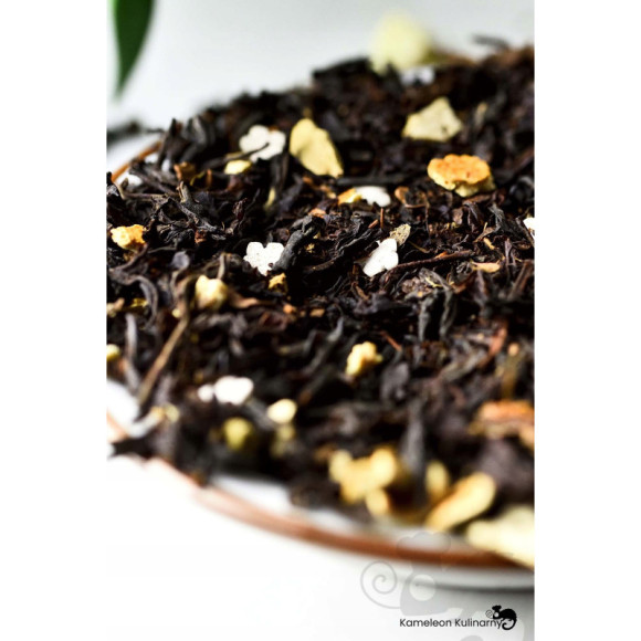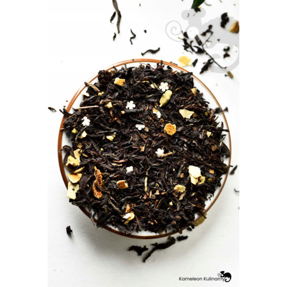 Skład: herbata czarna, skórka pomarańczy, kardamon, goździki, cynamon, kawałki imbiru, CUKROWE ŚNIEŻYNKI, aromat