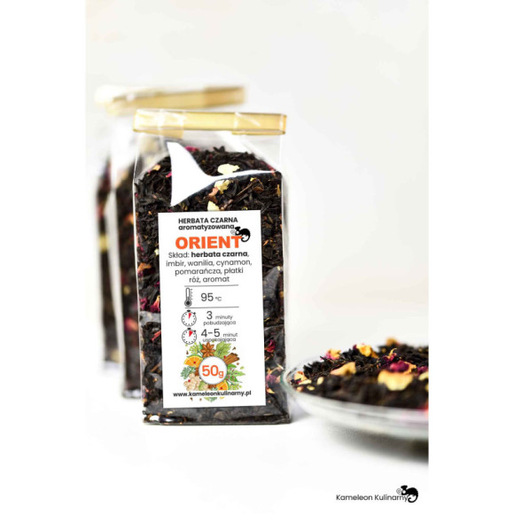 Skład: Czarna herbata, imbir, wanilia, cynamon, pomarańcza, płatki róż, aromat
