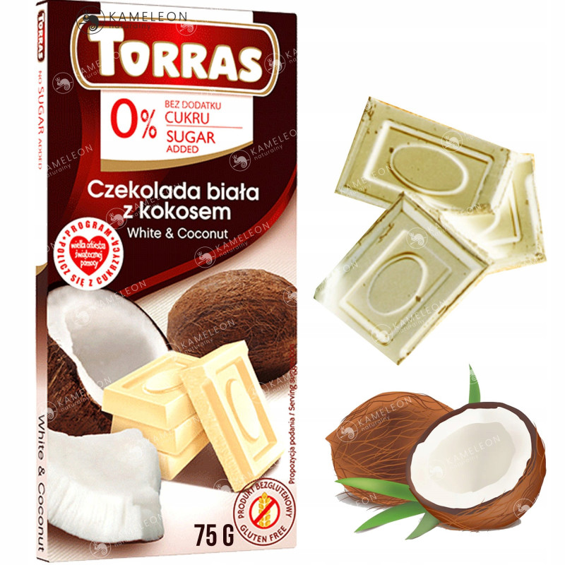 Substancja słodząca (maltitol), tłuszcz kakaowy, mleko pełne w proszku (18%), rozdrobniony orzech kokosowy (6%), inulina, emulgator (lecytyna słonecznikowa), aromat waniliowy.