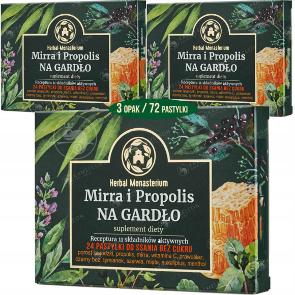 MIRRA i PROPOLIS NA GARDŁO BEZ CUKRU to preparat ze starannie dobranych składników ziołowych, przynoszący ulgę w chrypce i nieżycia gardła.
