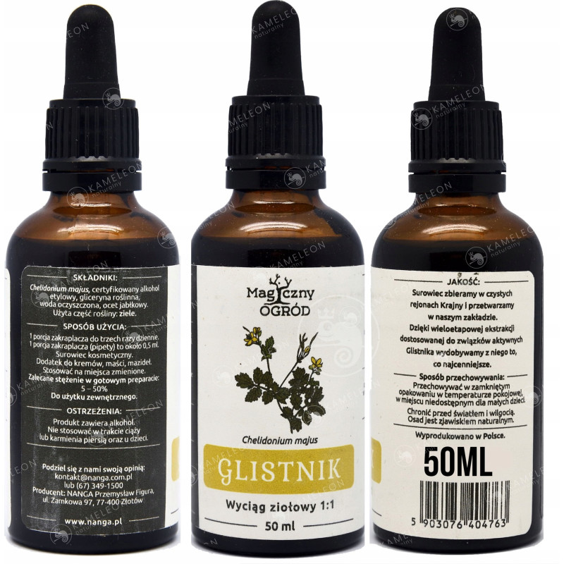 SKŁAD: ziele glistnika, certyfikowany alkohol, gliceryna roślinna, woda destylowana, ocet jabłkowy.