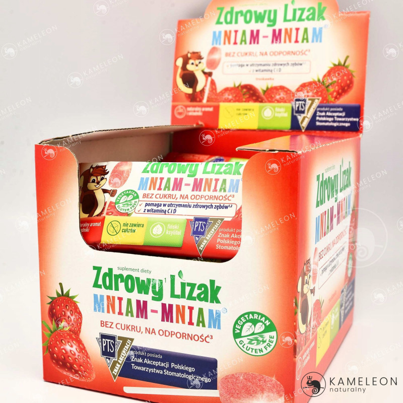 Podstawowym składnikiem Zdrowego Lizaka Mniam–Mniam jest fiński ksylitol który wykazuje działanie przeciwpróchnicze.