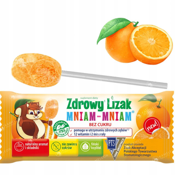 ZDROWY LIZAK MNIAM-MNIAM NA KONCENTRACJĘ I ODPORNOŚĆ o smaku pomarańczowym posiada akceptację Polskiego Towarzystawa Stomatologicznego.