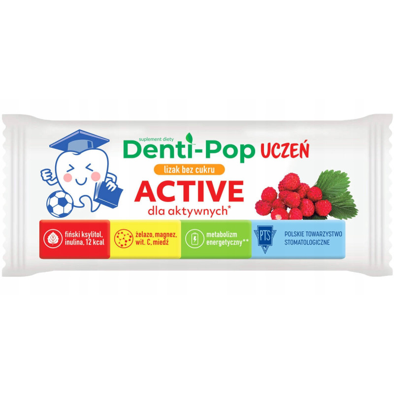 Suplement diety Denti-Pop Uczeń lizak bez cukru ACTIVE o smaku poziomkowym zawiera substancję słodzącą: fiński ksylitol. Nie zawiera cukrów. Dla osób aktywnych w okresie wzmożonego wysiłku fizycznego. Spożywanie żywności zawierającej ksylitol zamiast cukru pomaga w zachowaniu mineralizacji zębów. Witamina C pomaga w prawidłowej produkcji kolagenu w celu zapewnienia prawidłowego funkcjonowania zębów. Dodatkowo, lizak został wzbogacony w inulinę, magnez, witaminę C, żelazo i miedź. Inulina jest naturalnym prebiotykiem. Mikrobiom jelitowy dba o odporność poprzez interakcje z układem immunologicznym. Zawarta w składzie inulina z cykorii została dodatkowo oczyszczona z naturalnie występujących cukrów prostych. Magnez oraz witamina C wspierają utrzymanie prawidłowych funkcji psychologicznych. Miedź, żelazo, magnez i witamina C wspomagają właściwy metabolizm energetyczny.