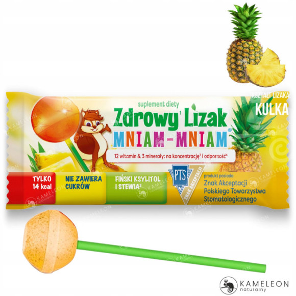 ZDROWY LIZAK MNIAM-MNIAM NA KONCENTRACJĘ I ODPORNOŚĆ o smaku ananasowym posiada akceptację Polskiego Towarzystawa Stomatologicznego.