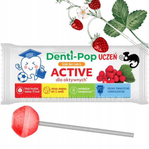Suplement diety Denti-Pop Uczeń lizak bez cukru ACTIVE o smaku poziomkowym zawiera substancję słodzącą: fiński ksylitol. Nie zawiera cukrów. Dla osób aktywnych w okresie wzmożonego wysiłku fizycznego. Spożywanie żywności zawierającej ksylitol zamiast cukru pomaga w zachowaniu mineralizacji zębów. Witamina C pomaga w prawidłowej produkcji kolagenu w celu zapewnienia prawidłowego funkcjonowania zębów. Dodatkowo, lizak został wzbogacony w inulinę, magnez, witaminę C, żelazo i miedź. Inulina jest naturalnym prebiotykiem. Mikrobiom jelitowy dba o odporność poprzez interakcje z układem immunologicznym. Zawarta w składzie inulina z cykorii została dodatkowo oczyszczona z naturalnie występujących cukrów prostych. Magnez oraz witamina C wspierają utrzymanie prawidłowych funkcji psychologicznych. Miedź, żelazo, magnez i witamina C wspomagają właściwy metabolizm energetyczny.