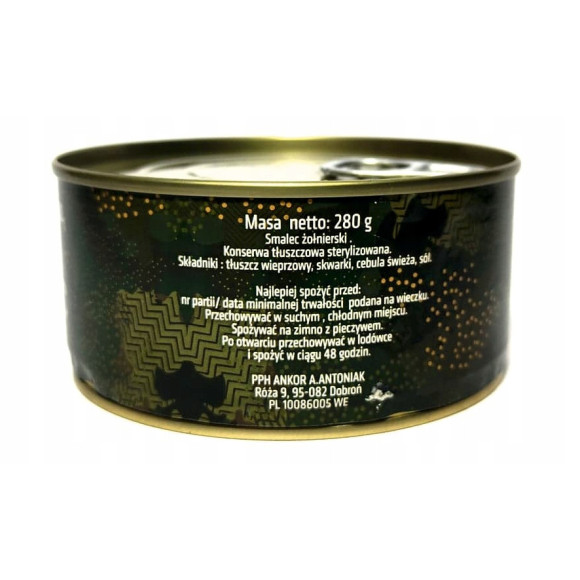 Słonina wytopiona ze skwarkami, przyprawy wyłącznie naturalne (w tym: czosnek, cebula, liść laurowy) sól, cukier