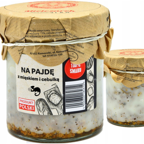 SKŁADNIKI: słonina wieprzowa, mięso wieprzowe 40%, boczek wieprzowy wędzony 15%, cebula smażona 15%, sól kuchenna, majeranek, czosnek.