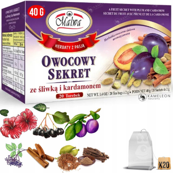 Skład: kwiat hibiskusa, owoc aronii, owoc śliwki 13%, aromaty, owoc bzu czarnego, cynamon 4 %, kardamon 1%, korzeń lukrecji.