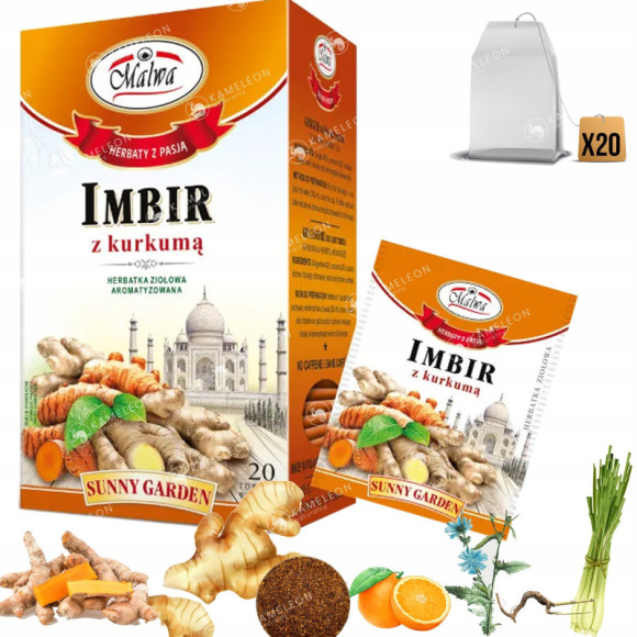 Imbir 42%, kurkuma 20%, rooibos - liście czerwonokrzewu (Aspalathus linearis), skórka pomarańczy, trawa cytrynowa, korzeń cykorii, aromaty