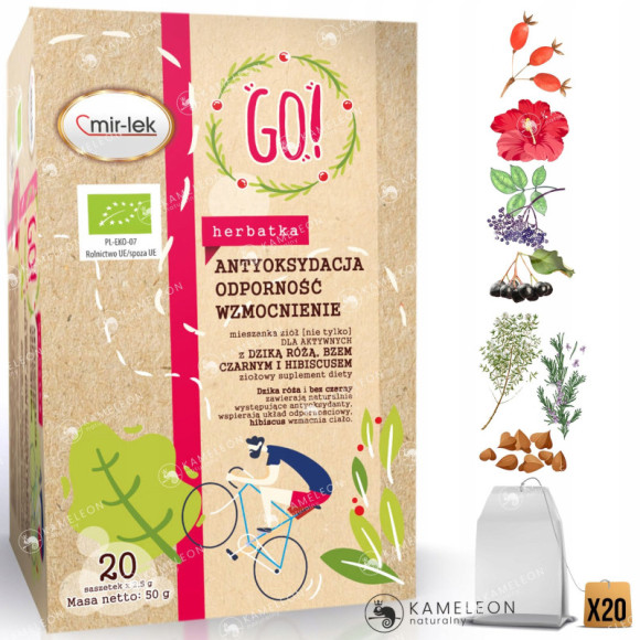 dzika róża owoc eko (25%), hibiscus eko (20%), bez czarny owoc eko (20 %), aronia owoc eko (20%), rozmaryn eko (5%), tymianek eko (5%), łuska gryki eko (5%).