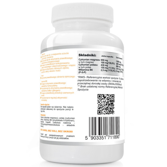 Magnez (cytrynian magnezu), potas (cytrynian potasu), witamina B6 (pirydoksalo-5-fosforan), kapsułka Vcaps® (celuloza roślinna hydroksypropylometyloceluloza - składnik otoczki).