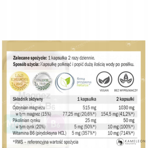 Cytrynian magnezu (magnez, pikolinian cynku (cynk), pirydoksyna HCL (witamina B6).