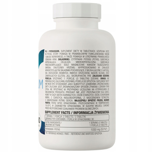 Jest to suplement diety zawierający potas w formie cytrynianu, charakteryzuje się on dobrą przyswajalnością. Potas skutecznie wspomaga pracę serca, układu krążenia oraz przyczynia się do ustabilizowania ciśnienia krwi. Osoby aktywne tracą ten pierwiastek razem z potem. Dlatego w okresach wzmożonego wysiłku warto się zastanowić nad suplementacją tego pierwiastka. Ale również odpowiada za prawidłowe nawodnienie organizmu oraz za gromadzenie glikogenu w mięśniach.