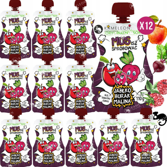 OryginalnySok MUS to zdrowy, płynny posiłek dla małego i dużego. Wykonany z przecierów ma gęstą konsystencję i bogaty aromat. Połączenie słodkiego jabłka, burak i maliny to naturalna i bez cukrowa alternatywa dla słodyczy. Wszystko zamknięte w zgrabnym opakowaniu można zabrać ze sobą do szkoły, na podwórko lub na spacer.