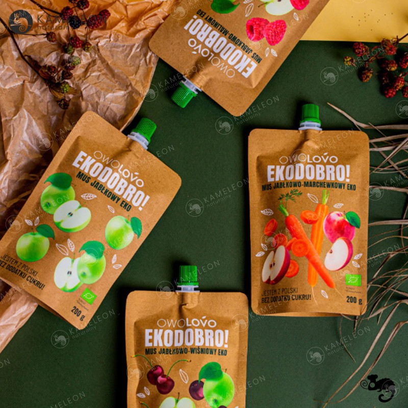 - zapakowany w wygodne opakowanie typu pouch, w którym znajduje się aż 200 g (ok. 1,5 jabłka) pysznego musu owocowego