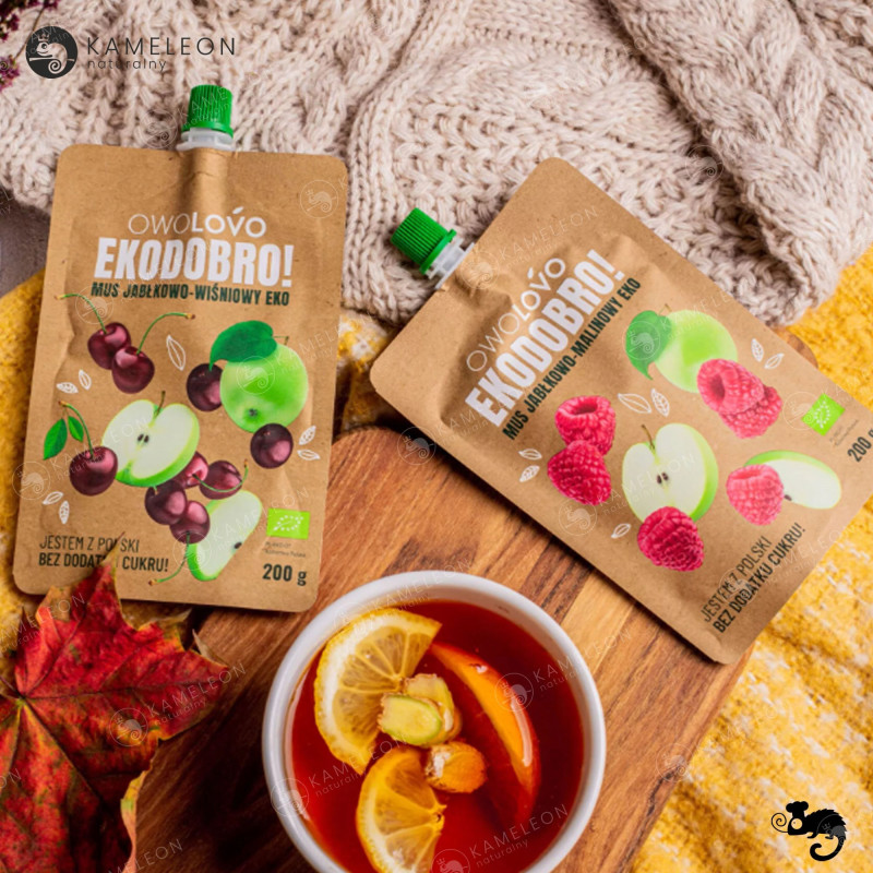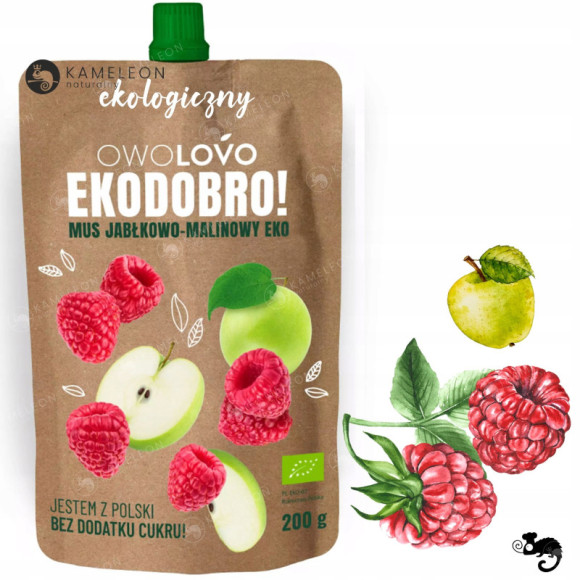 Składniki: przecier z EKO jabłek 90%, przecier z EKO malin 10%