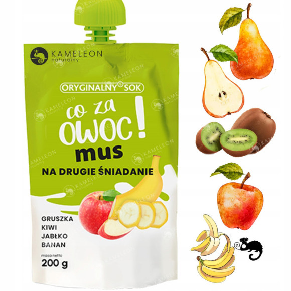 OryginalnySok MUS co za owoc 200g to zdrowy, płynny posiłek dla małego i dużego. Wykonany z przecierów ma gęstą konsystencję i bogaty aromat. Połączenie słodkiej gruszki, kiwi, jabłka i banana to naturalna i bez cukrowa alternatywa dla słodyczy. Wszystko zamknięte w zgrabnym opakowaniu można zabrać ze sobą do szkoły, na podwórko lub na spacer oraz podczas aktywności fizycznej.