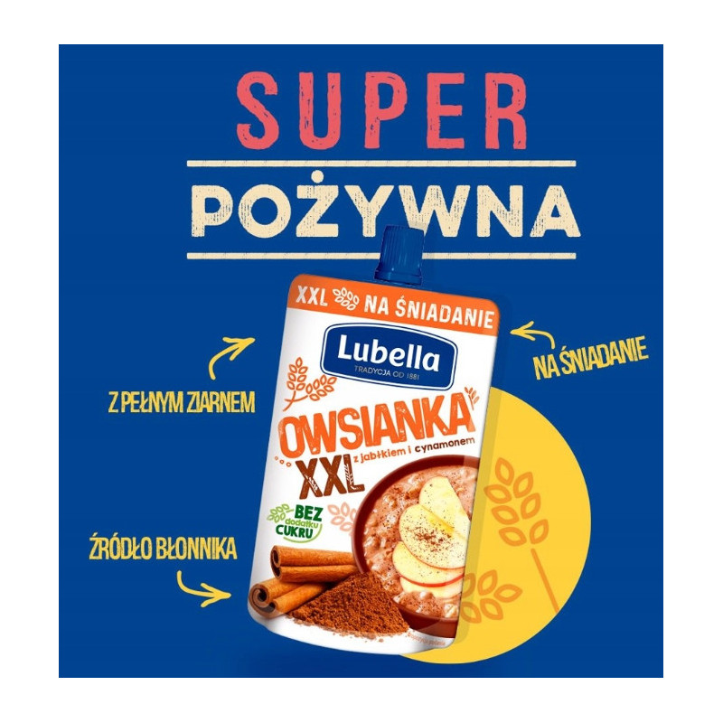 Owsianka Lubella to lubiana i pełnowartościowa przekąska, w dopasowanej do potrzeb konsumentów formie. Wysoka zawartość zbóż – aż 40% owsianki – z dodatkiem owoców i jogurtu sprawia, że jest gęsta, sycąca i pyszna. Dzięki wygodnemu opakowaniu ta pożywna i smakująca jak domowa owsianka nowość będzie doskonałą przekąską w szkole, w pracy czy w podróży. Teraz dostępna jest również w większym opakowaniu – na większy głód! Produkt nie zawiera dodatku cukru i jest dostępny w dwóch smakach: