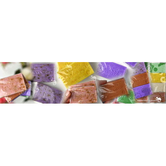 To seria przepięknie pachnących mydeł produkowanych we Francji. Sa to prostokątne kostki z tłoczeniem, w uroczych zapachach.