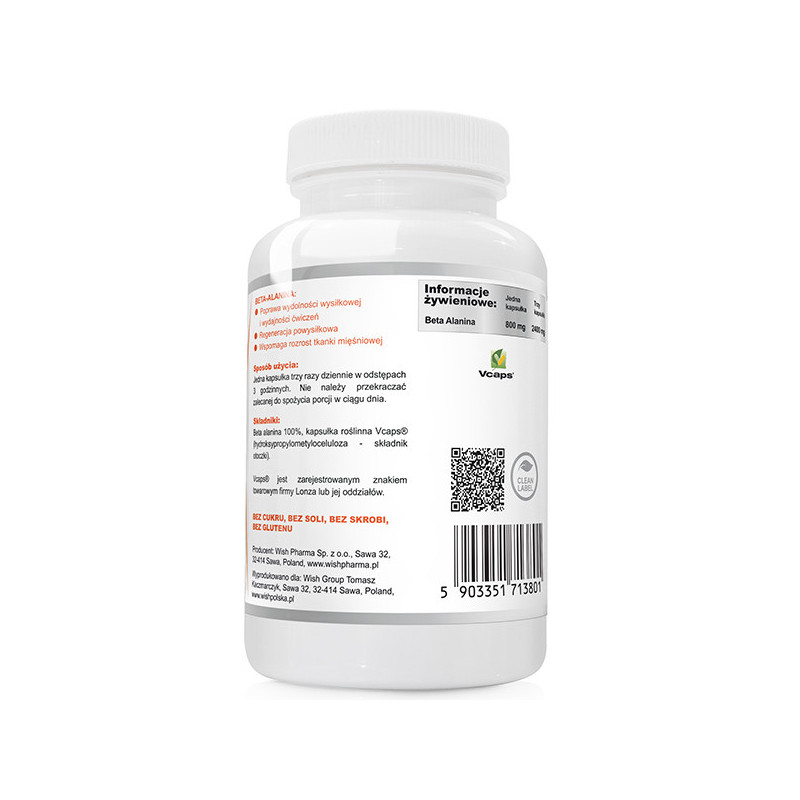 SKŁADNIKI: Beta alanina 100%, kapsułka roślinna Vcaps® (hydroksypropylometyloceluloza - składnik otoczki).