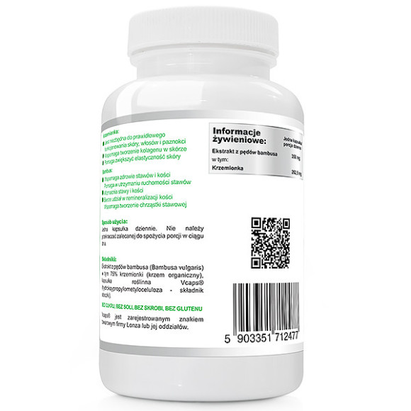 Ekstrakt z pędów bambusa (Bambusa vulgaris) w tym 75% krzemionki (krzem organiczny), kapsułka roślinna Vcaps® (celuloza roślinna - hydroksypropylometyloceluloza-skladnik otoczki)