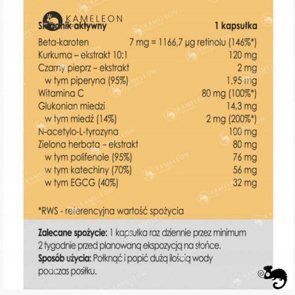 Ekstrakt z kłącza kurkumy (Curcuma longa) 10:1, N-acetylo-L-tyrozyna, ekstrakt z liści zielonej herbaty (Camellia sinensis) standaryzowany na zawartość min. 95% polifenoli, min. 70% katechin i min. 40% katechin, kwas L-askorbinowy (witaminaC), glukonian miedzi (miedź), beta-karoten, ekstrakt z owoców czarnego pieprzu BioPerine® (Piper nigrum) standaryzowany na zawartość min. 95% piperyny.