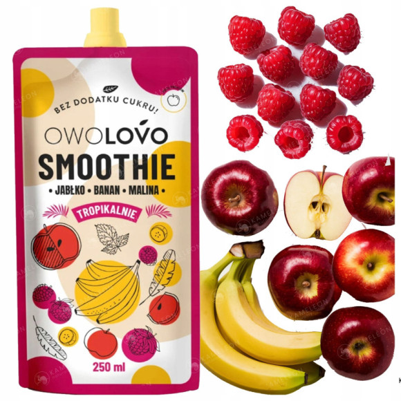 Smoothie jabłko, banan, malina z przecierów i zagęszczonego soku. Produkt pasteryzowany. Owolovo smoothie Rozkoszne tropiki i polskie owoce w idealnym, słodkim połączeniu. Daj się porwać słodyczy banana i maliny w towarzystwie pysznego jabłka. Smakuj 100 % owoców bez końca!