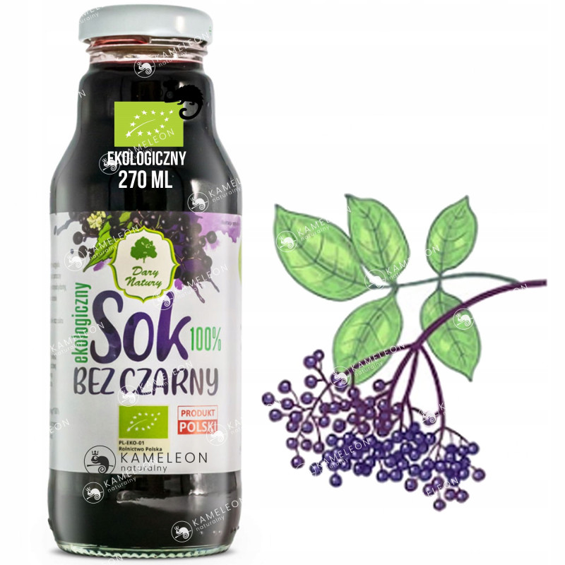 Ekologiczny, tłoczony sok z czarnego bzu. Sok jest nieklarowany, bez konserwantów, bez dodatku cukru, poddany jedynie pasteryzacji.