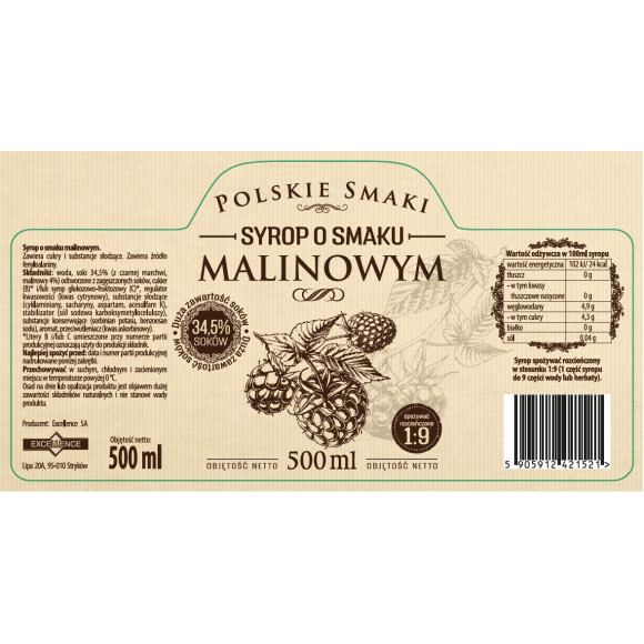 Przygotowany z miłości do doskonałych polskich smaków, syrop o smaku malinowym łączy w sobie prostą recepturę i najlepszą kompozycję soków owocowych. Dzięki dużej zawartości soków, ten gęsty syrop zabierze Was w podróż po najwspanialszych polskich aromatach.