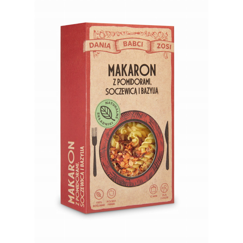 Makaron w sosie pomidorowym Babci Zosi to pyszna kompozycja roślinnego makaronu, pomidorów i aromatycznych przypraw w gęstym sosie gotowa w zaledwie 10 minut. Makarony Babci Zosi to świetna propozycja na zdrowy, sycący posiłek, gdy nie ma się czasu lub ochoty przygotowywać dania od podstaw. Sprawdzą się także z dodatkiem ulubionych składników: sera, warzyw lub mięsa. Zawartość opakowania wystarczy na dwie pełne porcje.