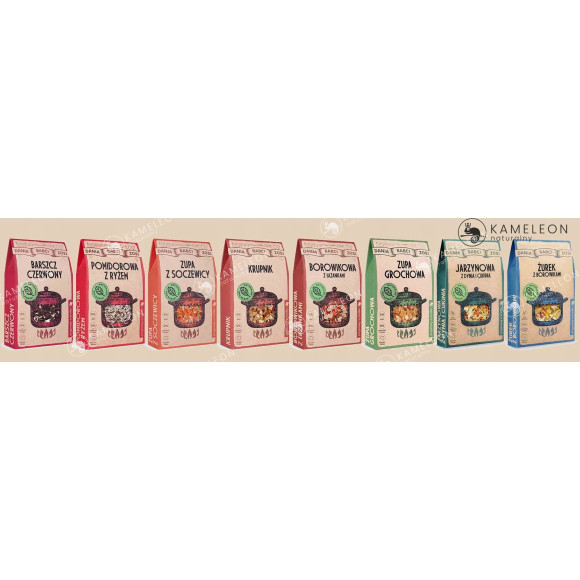 kasza bulgur (z PSZENICY durum) 67%, soczewica czerwona 10%, pomidor suszony 5,5%, soczewica zielona 5%, cebula prażona (cebula, olej słonecznikowy), płatki drożdżowe, cukinia suszona 2%, warzywa suszone (marchew, pasternak, SELER, pietruszka, lubczyk)sól morska, czosnek, kmin rzymski, pieprz cayenne, tymianek, bazylia, pieprz czarny.