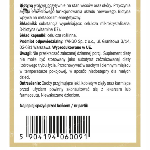 Substancja wypełniająca: celuloza mikrokrystaliczna, D-biotyna (witamina B7).