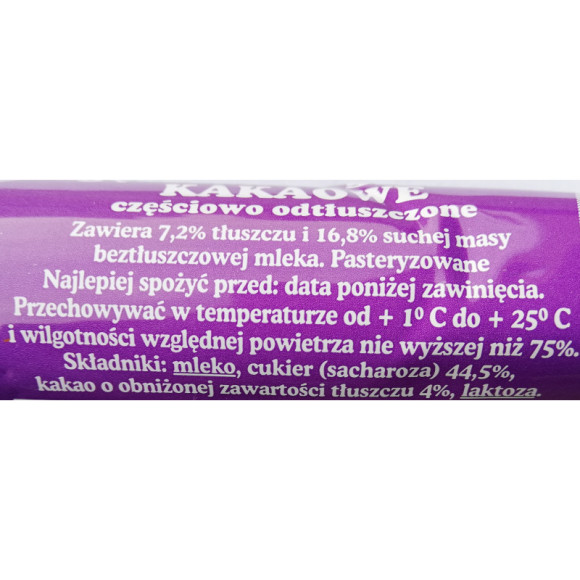 Składniki: mleko, cukier (sacharoza) 44,5%, kakao o obniżonej zawartości tłuszczu, laktoza