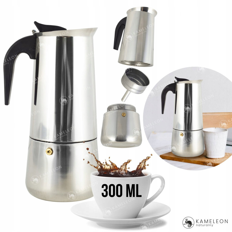 Produkt o pojemności 300 ml pozwala na przygotowanie 6 filiżanek kawy. Posiada funkcjonalny bakelitowy uchwyt, który stabilnie będzie się trzymać w dłoni.