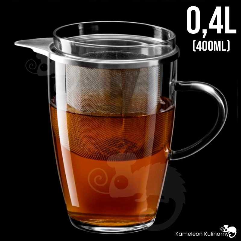 Szklanka żaroodporna z zaparzaczem oraz szklaną pokrywką marki THERMO jest przeznaczona przede wszystkim do parzenia herbaty, może być jednak używana bez sitka do innych gorących napojów np. kawy. Świetnie sprawdzi się także do cafe latte. Borokrzemowe szkło żaroodporne, z którego wykonana jest szklanka jest odporne na temperatury od -40°C do 300°C.