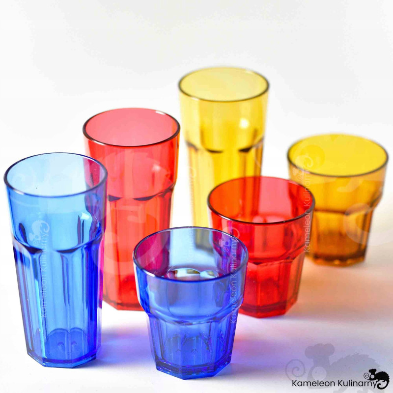 SERIA KOLOROWYCH SZKLANEK z poliwęglanu to nietłukące, super praktyczne SZKLANKI w 3 kolorach. Podczas słonecznego dnia czy też naczyń używanych w ogrodzie - możemy nadać stołowi dużo blasku, koloru, refleksów. Wprowadzają nie tylko kolor, ale dużo energii. Poza tym - są bezpieczne bo nietłukące. Można je dzięki temu wziąć do ogrodu, na grilla, do basenu bez obaw o uszkodzenie czy potłuczenie. Dostępne są w 2 wielkościach 250 i 360ml, w 3 kolorach: niebieski, czerwony i brąz (nazywany czasem złotym).